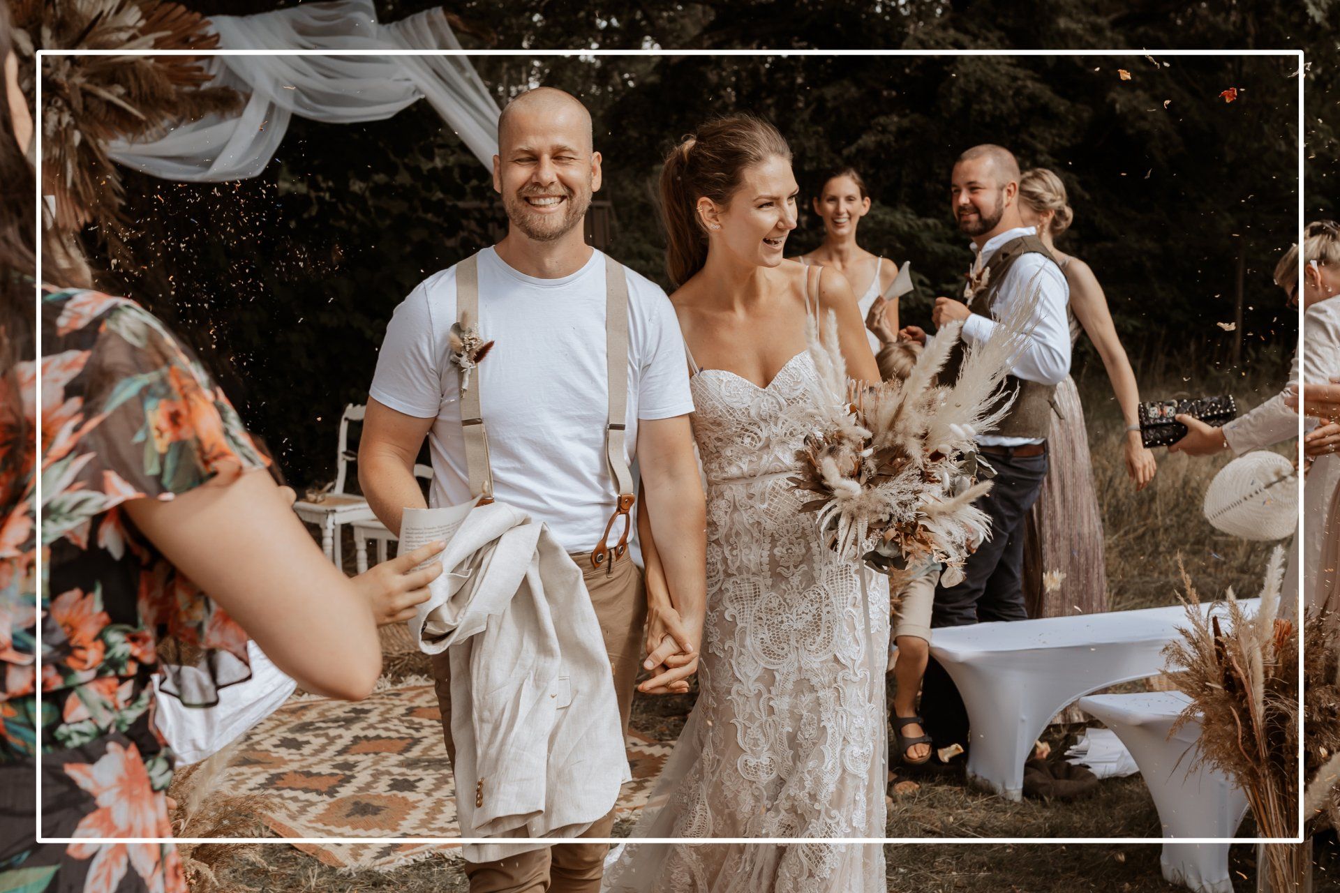 Wild-romantisch auf einer Wiese unter einer beeindruckenden Linde gaben sich Davina und Tobias das Ja-Wort. Wunderschöne Trockengestecke und viel andere detailreiche Deko haben es zu einem wundervollen Ort zum „JA -sagen“ gemacht.